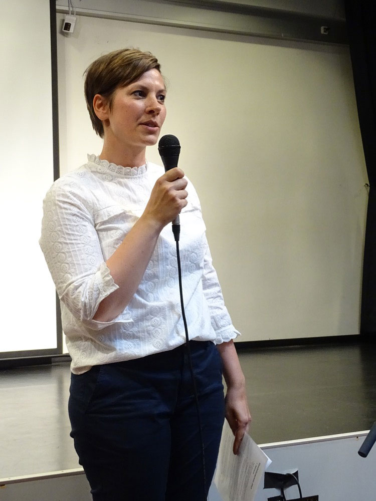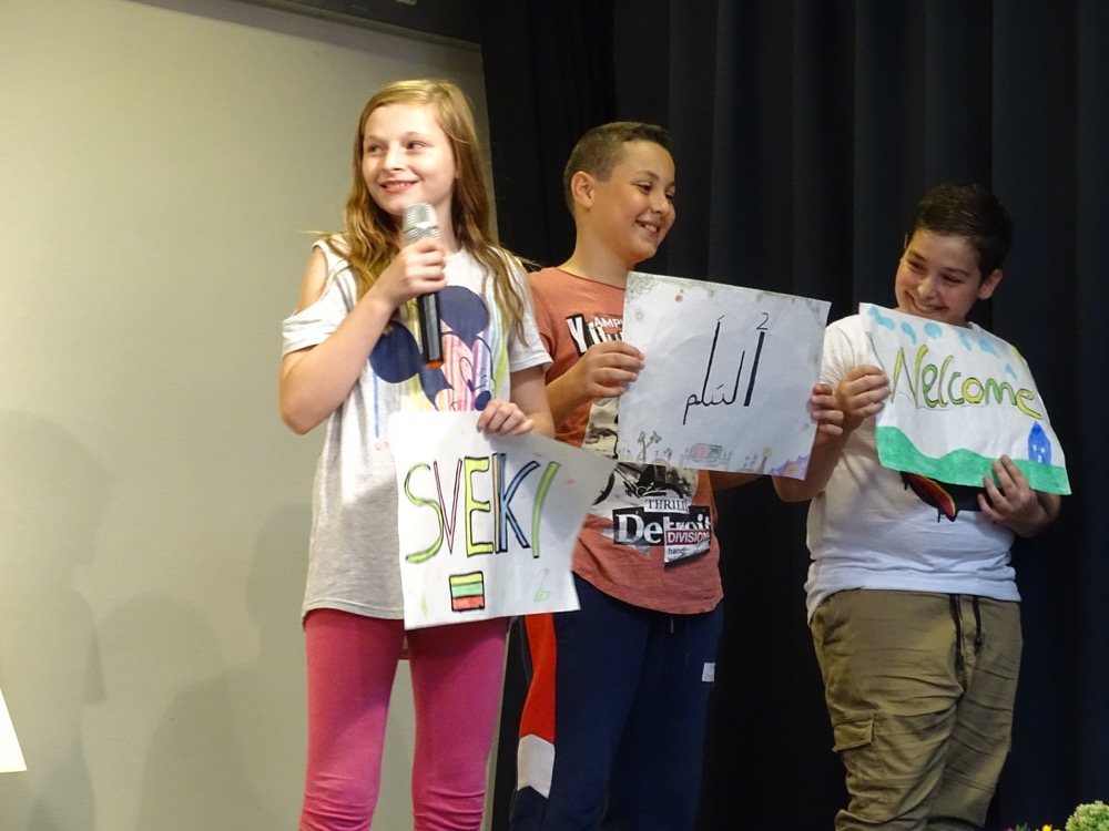 SchülerInnen aus Jahrgang 9 füllten die Aula zu Beginn der Aufnahmefeier mit rhythmischen Klängen und ließen die Veranstaltung schwungvoll starten. SechstklässlerInnen begrüßten im Anschluss die neuen FünftklässlerInnen in verschiedenen Sprachen an unserer bunten Schule und trugen mit dem Cup Song zur guten Laune bei.