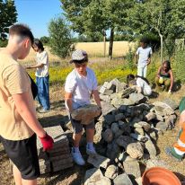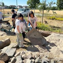 Am Montag, 30. Juni 2025, baute, wir, die Klasse 7.4, gemeinsam mit Frau Jechimer und den Azubis des Bauhofs der Stadt Raunheim ein Eidechsenhabitat. Hierfür füllten wir als erstes Kies in ein großes Loch, das der Bauhof schon für uns in Feldrandlage ausgehoben hatte. Danach folgten deutlich größere Steine und Baustämme. Einige konnte man allein gar nicht tragen, aber mit Teamarbeit landete schließlich alles am dafür vorgesehenen Ort. Frau Jechimer erklärte uns, dass die Zwischenräume zwischen den großen Steinen mögliche die Verstecke für die Eidechsen sind. Neben den Steinhaufen schütteten wir anschließend noch Sand und begrenzten ihn mit weiteren Baumstämmen. Im Sand können die Eidechsen dann ihre Eier ablegen.