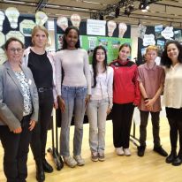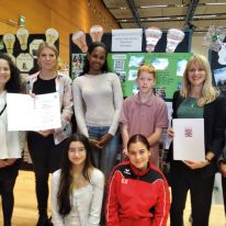 Vier Schülerinnen und Schüler des Jahrgangs 8, die Lehrkräfte K. Bender und N. Proske sowie Karin Jechimer nahmen die Auszeichnung freudig entgegen.