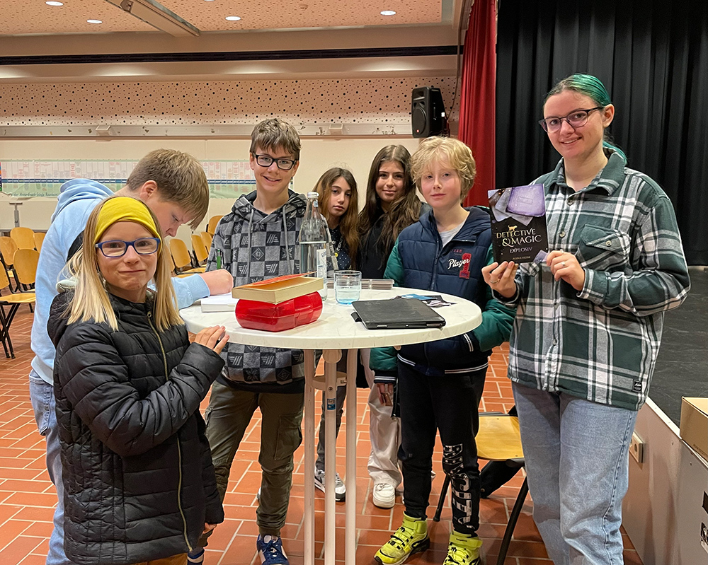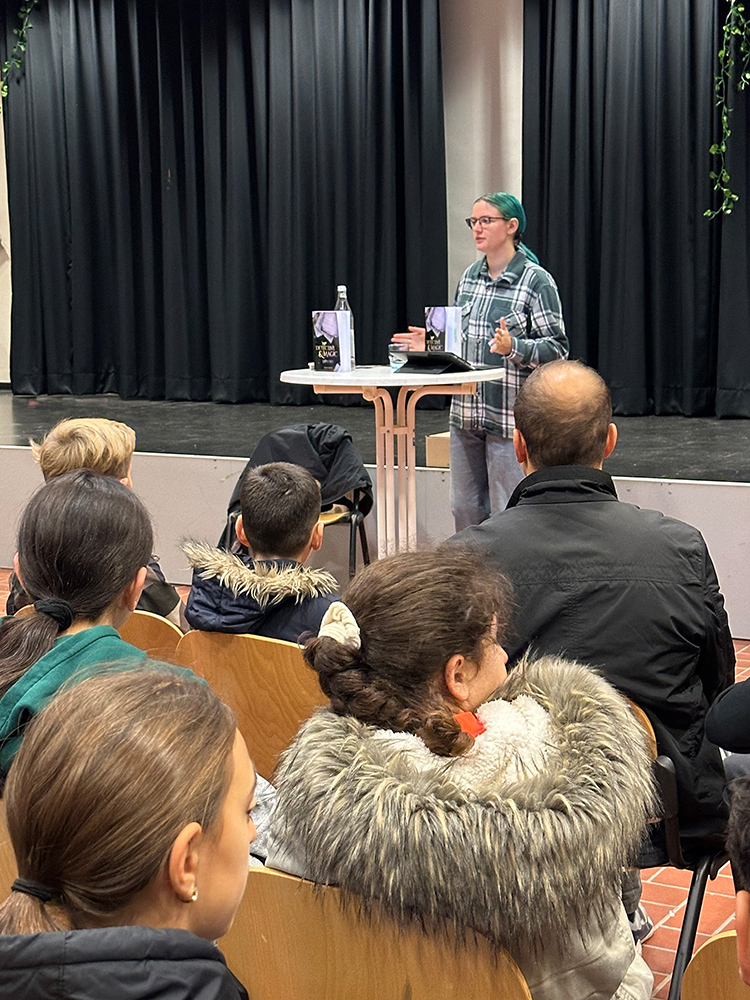 Heute, am 22. November 2023, war Alina Hesse bei uns in der Schule. Sie ist eine Autorin und war sehr nett. Sie ist erst 15 Jahre alt, kommt aus Rüsselsheim und hat gerade ihr erstes Buch namens „Detective & Magic“ veröffentlicht. In der Schülerbücherei kann man es sogar schon ausleihen. Aus ihrem Buch hat sie uns auch ein bisschen vorgelesen, vor allem aber ganz viele Fragen unseres Jahrgangs beantwortet. Bald erscheint sogar schon ihr zweites Buch „Detective & Mary“.