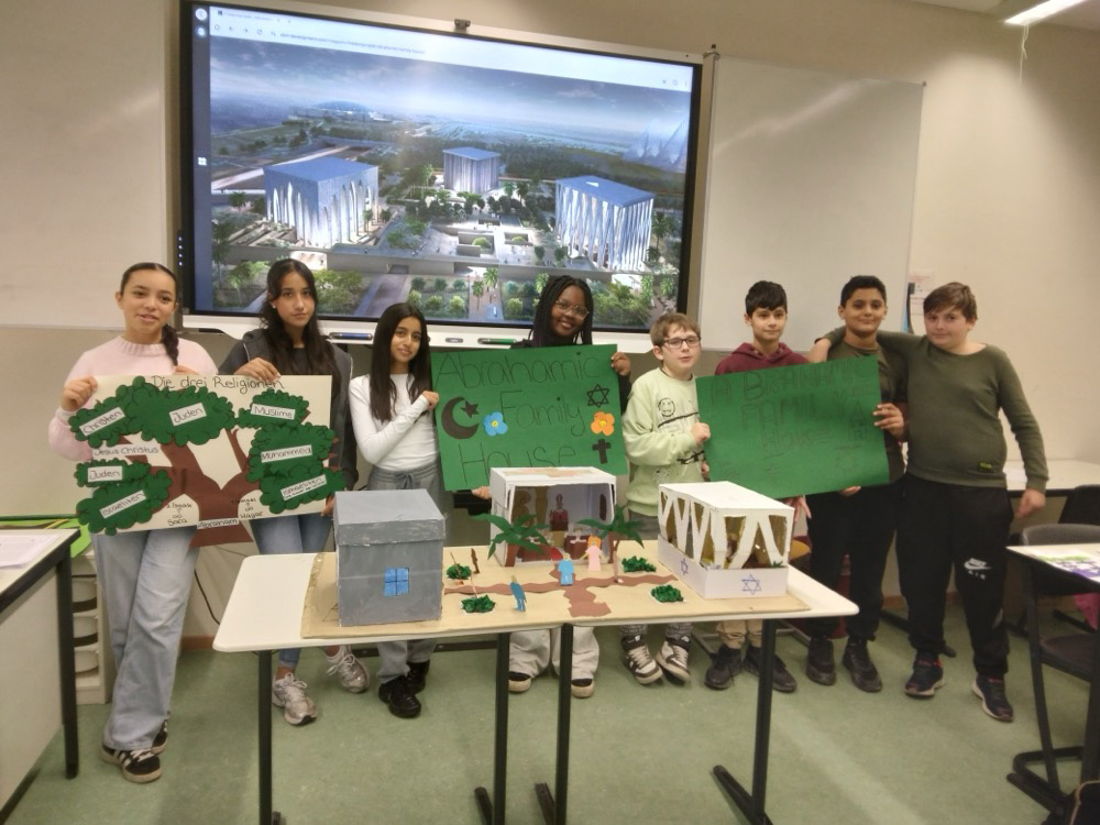 In unserer Projektwoche lernten wir das Thema „Haus der Religionen“ kennen. Wir sprachen über den Islam, das Christentum, das Judentum, den Hinduismus und den Buddhismus und lernten viel Neues. Besonders spannend war unser Bastelprojekt zum Abrahamic Family House. Das ist ein besonderer Ort, an dem eine Moschee, eine Kirche und eine Synagoge nebeneinander stehen als Zeichen für Frieden und Freundschaft. Wir bauten diese drei Gebäude als kleine Häuschen selbst und gestalteten viele bunte Menschenfiguren. Dabei lernten wir, dass Abraham unser gemeinsamer Stammvater ist. Das bedeutet, dass die Religionen miteinander verwandt sind. Und wir merkten: es gibt gar nicht so viele Unterschiede, sondern viele schöne Gemeinsamkeiten. Alle Religionen wünschen sich Frieden, Respekt und Zusammenhalt, genau wie wir!