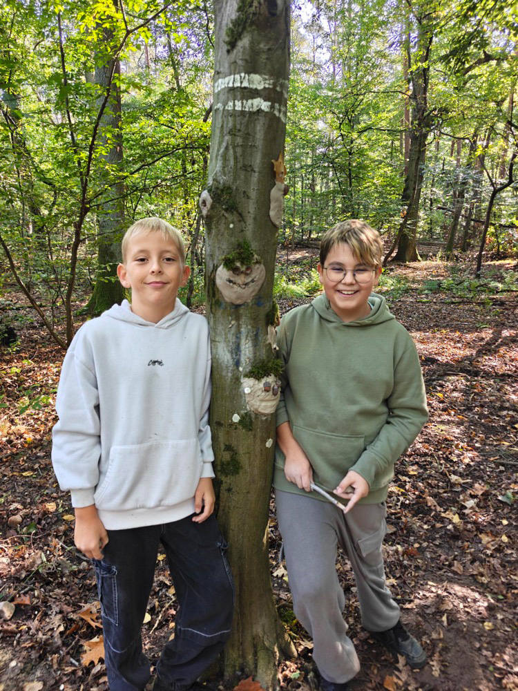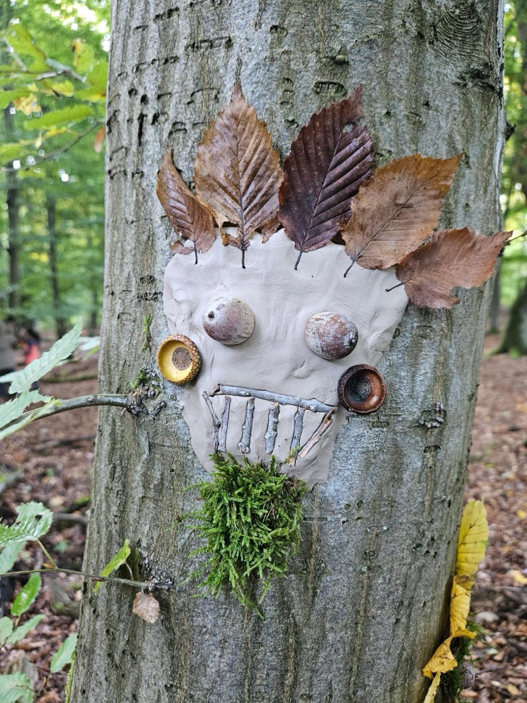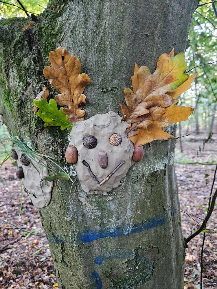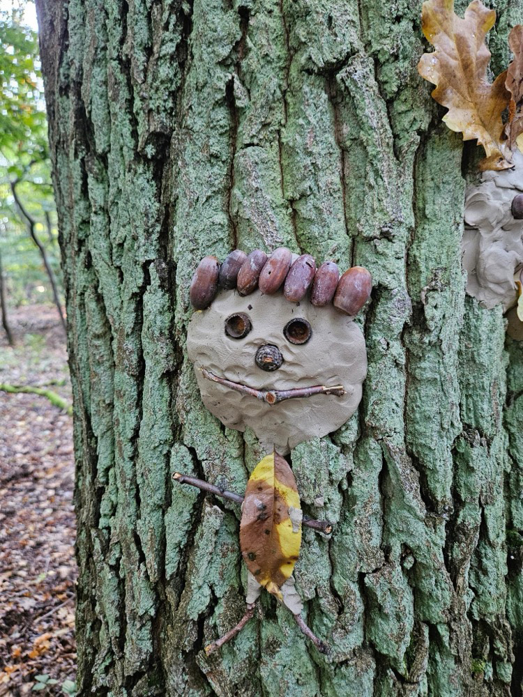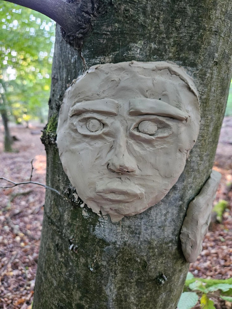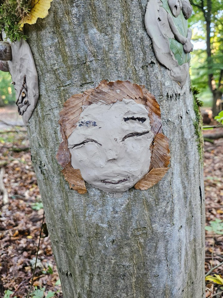- Kreativ mit Naturmaterialien: Im Anschluss beschäftigten sie sich mit dem Thema Waldkunst. Sie gestalteten mit Ton fantasievolle Gesichter an Baumstämmen und lernten dabei, Naturprodukte bewusst einzusetzen.