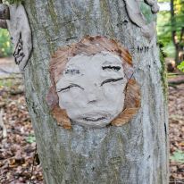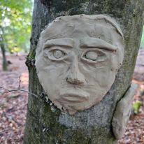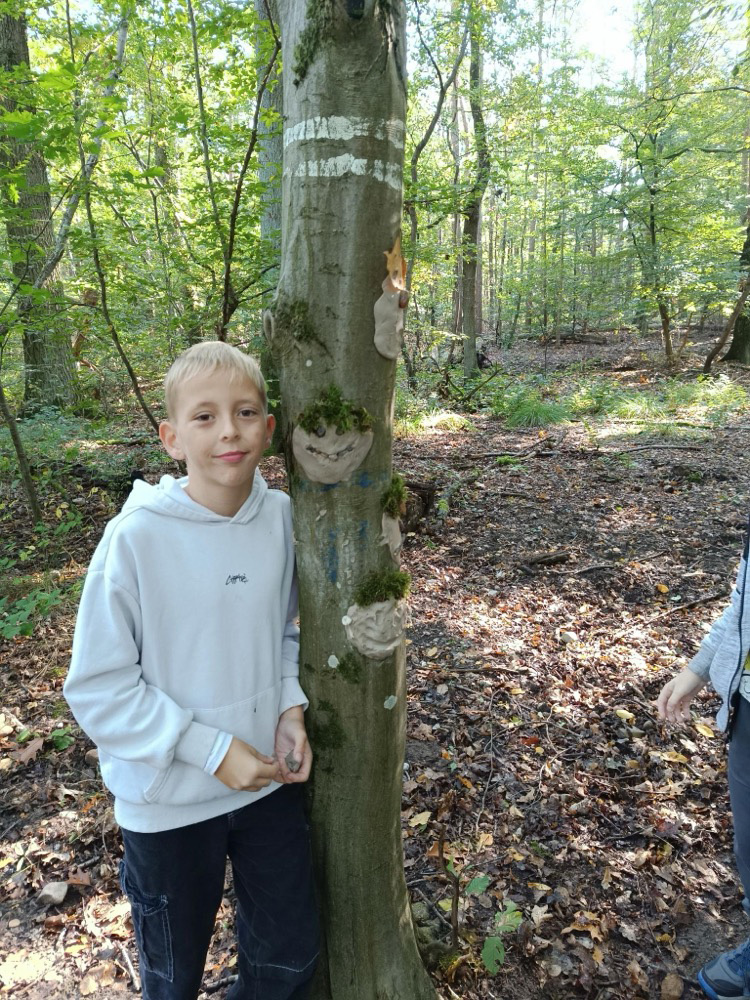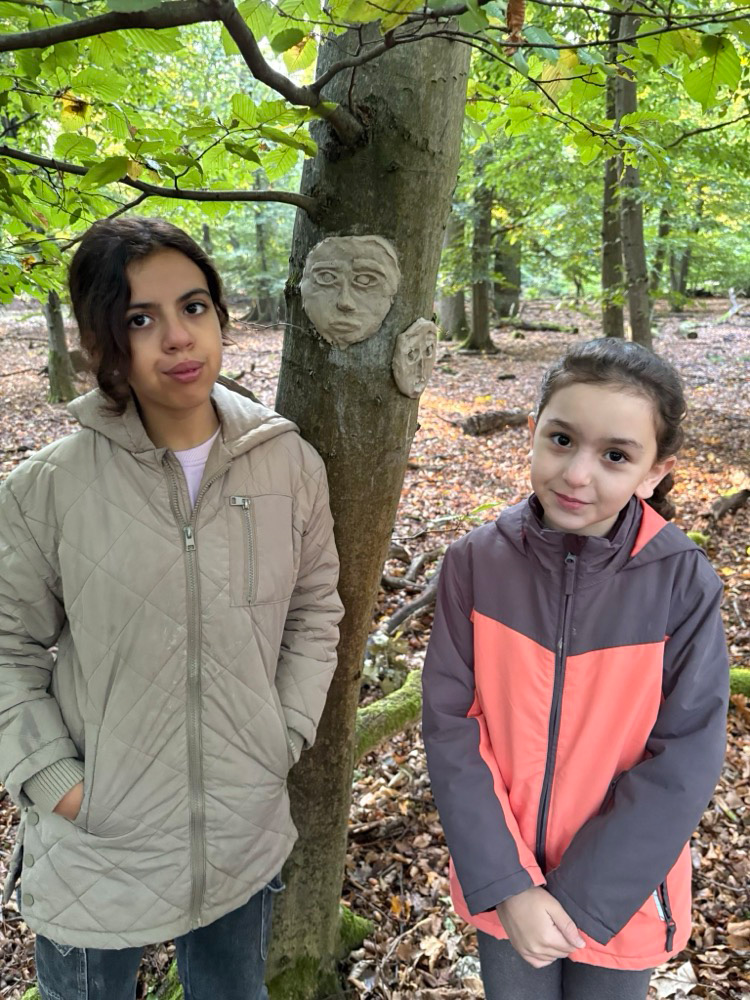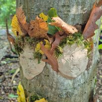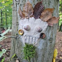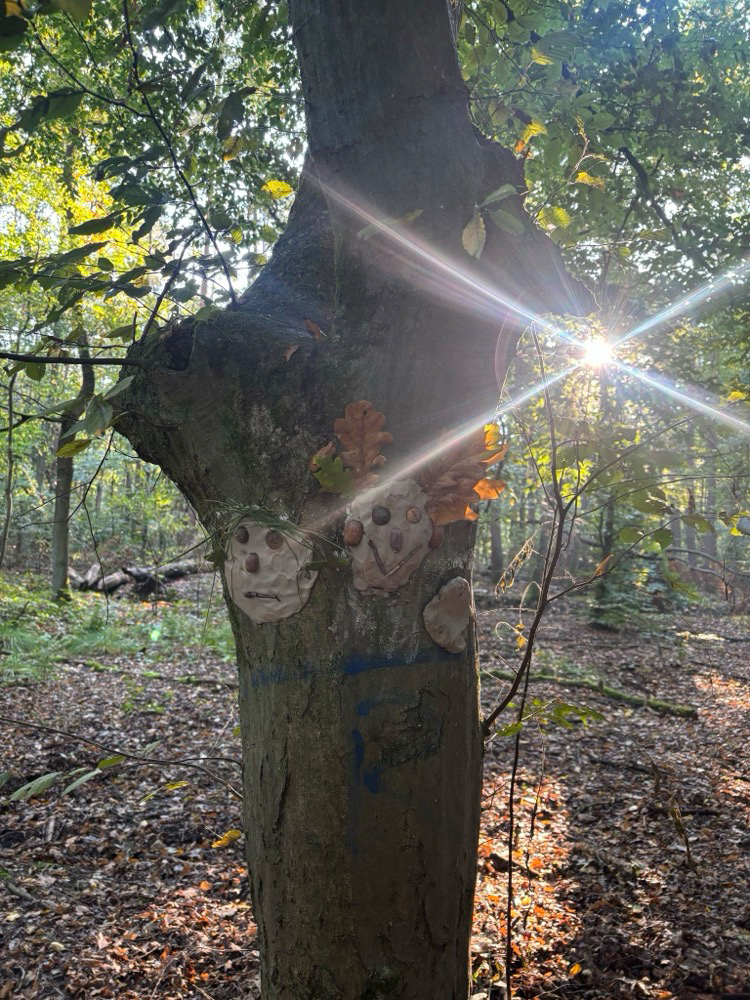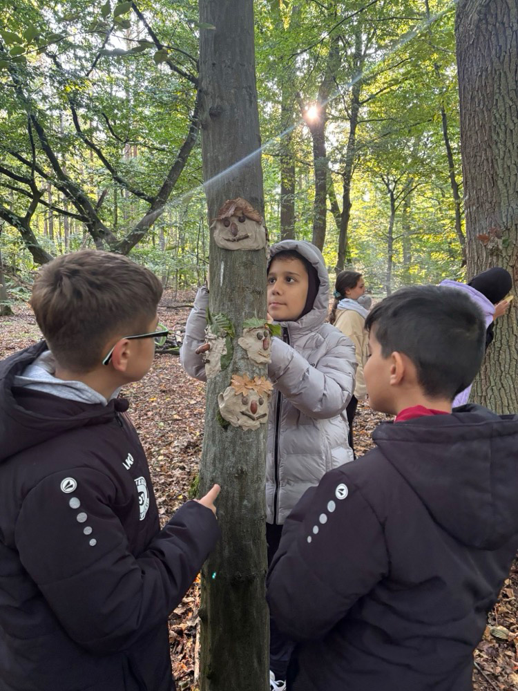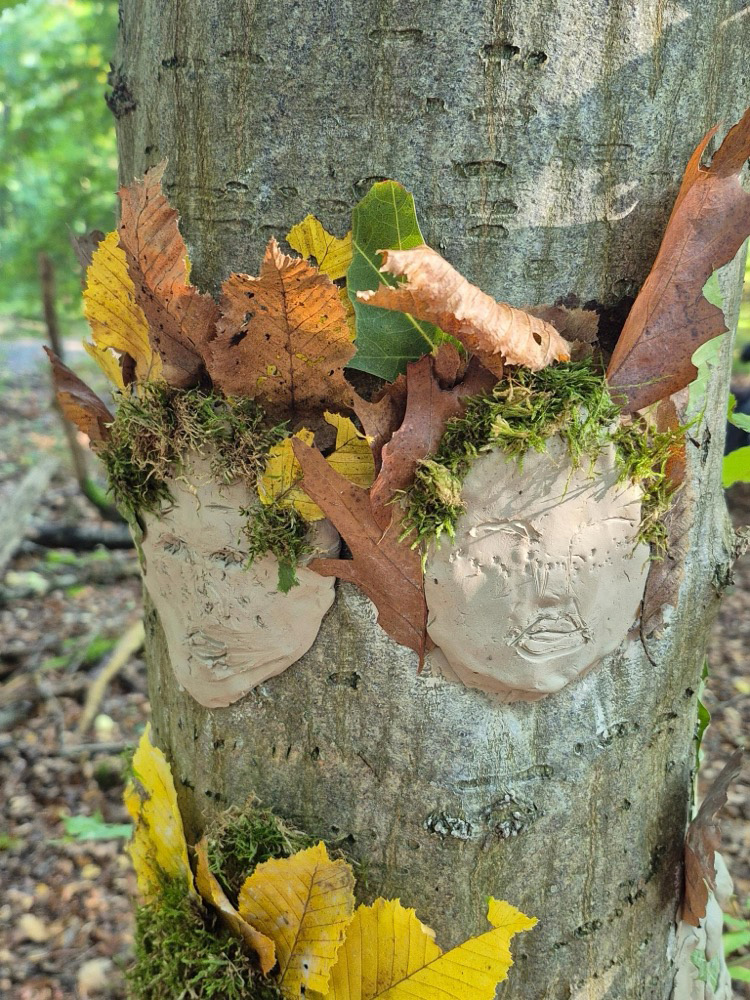 - Kreativ mit Naturmaterialien: Im Anschluss beschäftigten sie sich mit dem Thema Waldkunst. Sie gestalteten mit Ton fantasievolle Gesichter an Baumstämmen und lernten dabei, Naturprodukte bewusst einzusetzen.