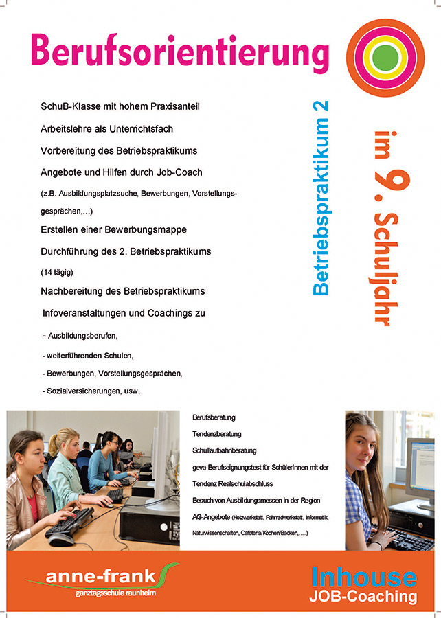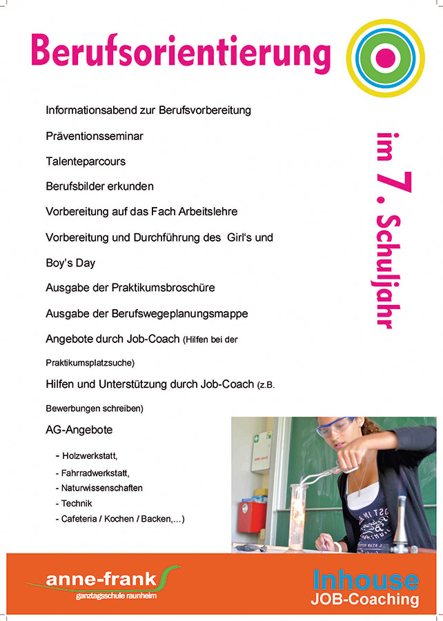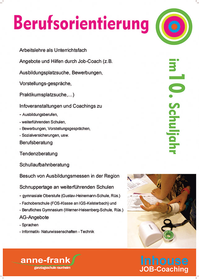 An der Anne-Frank-Schule werden Schülerinnen und Schüler bereits ab Klassenstufe 7 optimal auf den späteren Übergang von der Schule in den Beruf vorbereitet. Dies beschränkt sich aber keinesfalls nur auf den Fachunterricht in Arbeitslehre (in dem z.B. Bewerbungen geschrieben und verschiedene Berufsfelder erkundet werden). Viele zusätzliche Angebote ermöglichen den Lernenden vielfältigste Einblicke in die Berufswelt. So nimmt bspw. der Jahrgang 7 am Girl’s- bzw. Boy’s-Day und an einem Berufeparcous teil, in Klassenstufe 8 und 9 werden als Ergänzung zu den zwei mehrwöchigen Praktika mehrere Praxistage durchgeführt. Dabei sind mannigfaltige Kooperationen mit Betrieben aus der Umgebung entstanden, durch die die Heranwachsenden z.B. an Bewerbungstrainings oder auch Berufsinformationstagen teilnehmen können.