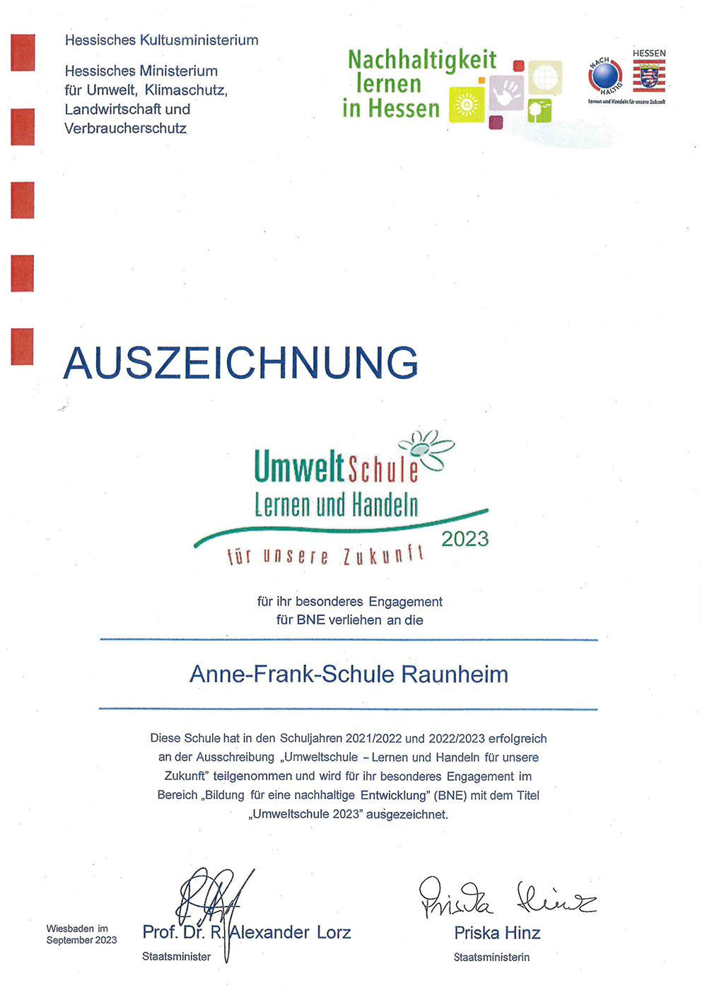 Wieder liegen zwei erfolgreiche Jahre hinter uns, in denen die Schüler und Schülerinnen der Anne-Frank-Schule im Bereich Umweltbildung und ökologischer Bildung gelernt, gearbeitet und sich engagiert haben. Genau für dieses Engagement wurde die Anne-Frank-Schule am 18. September 2023 erneut als Umweltschule - Lernen und Handeln für unsere Zukunft 2023, ausgezeichnet und gewürdigt.