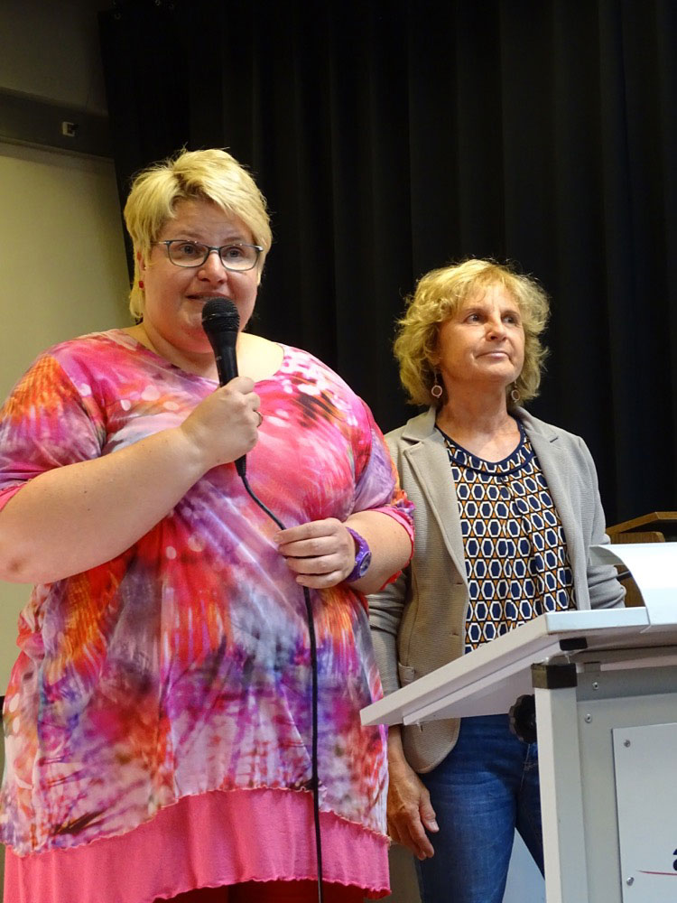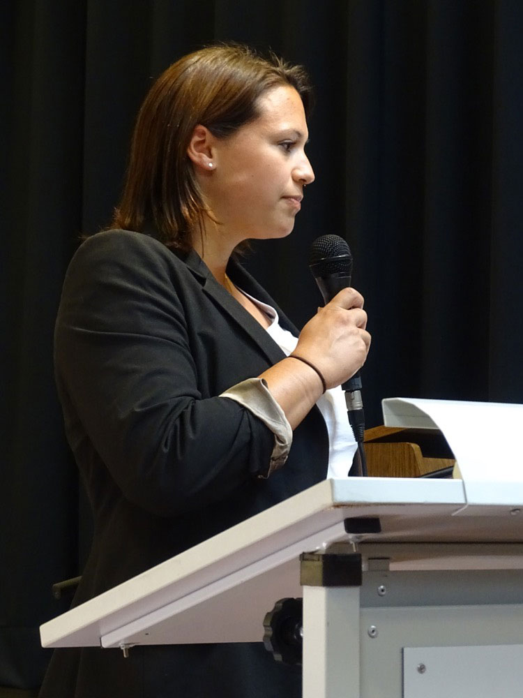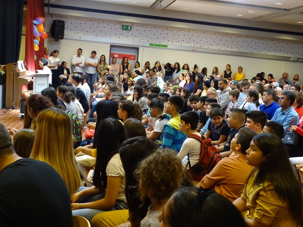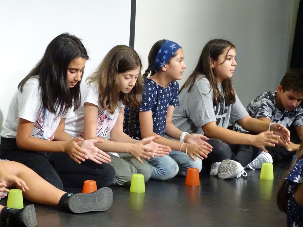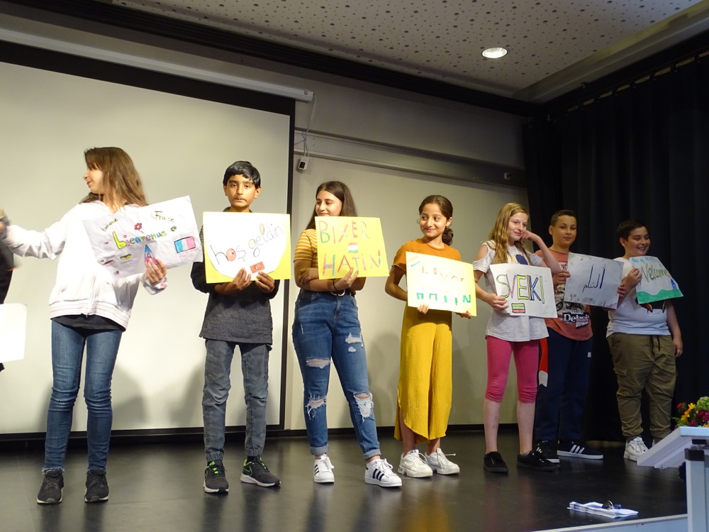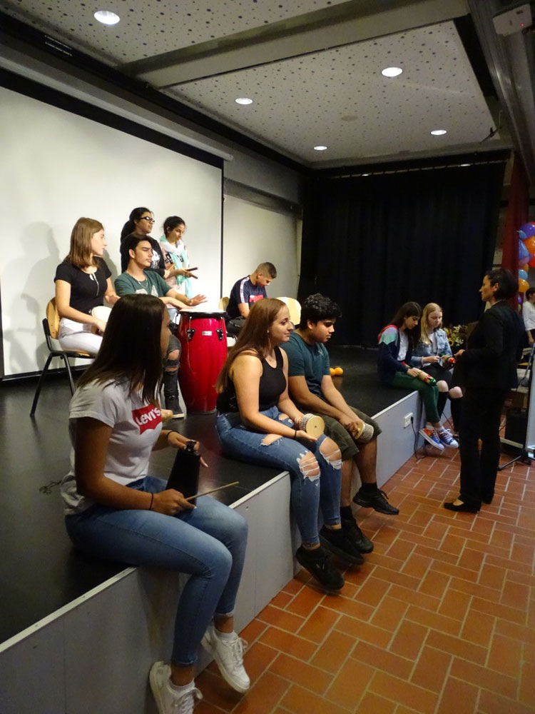 SchülerInnen aus Jahrgang 9 füllten die Aula zu Beginn der Aufnahmefeier mit rhythmischen Klängen und ließen die Veranstaltung schwungvoll starten. SechstklässlerInnen begrüßten im Anschluss die neuen FünftklässlerInnen in verschiedenen Sprachen an unserer bunten Schule und trugen mit dem Cup Song zur guten Laune bei.