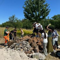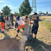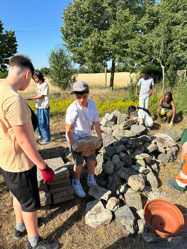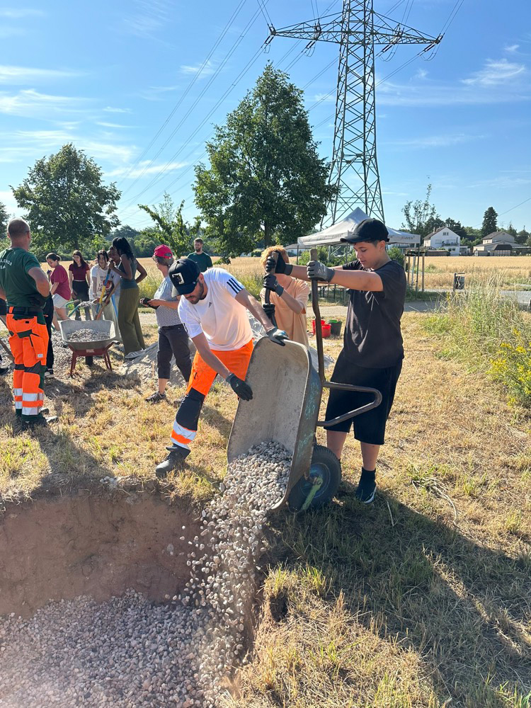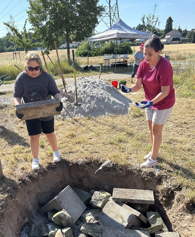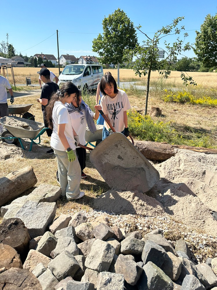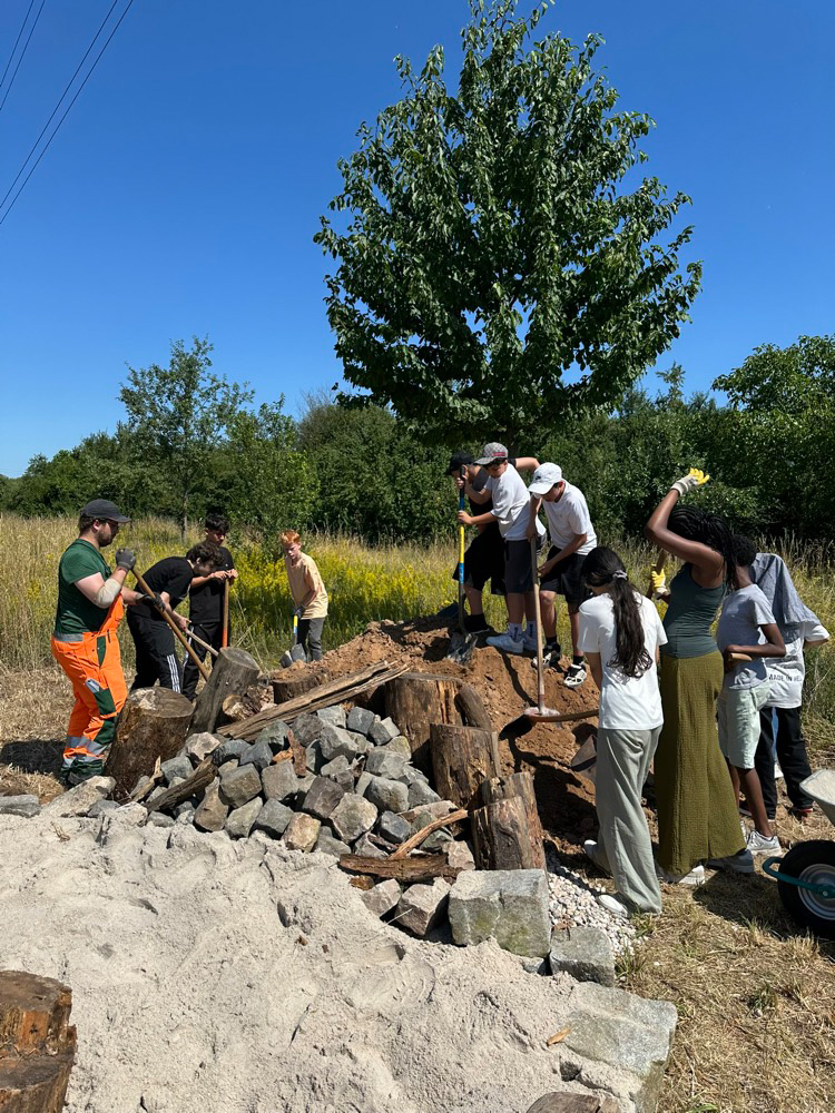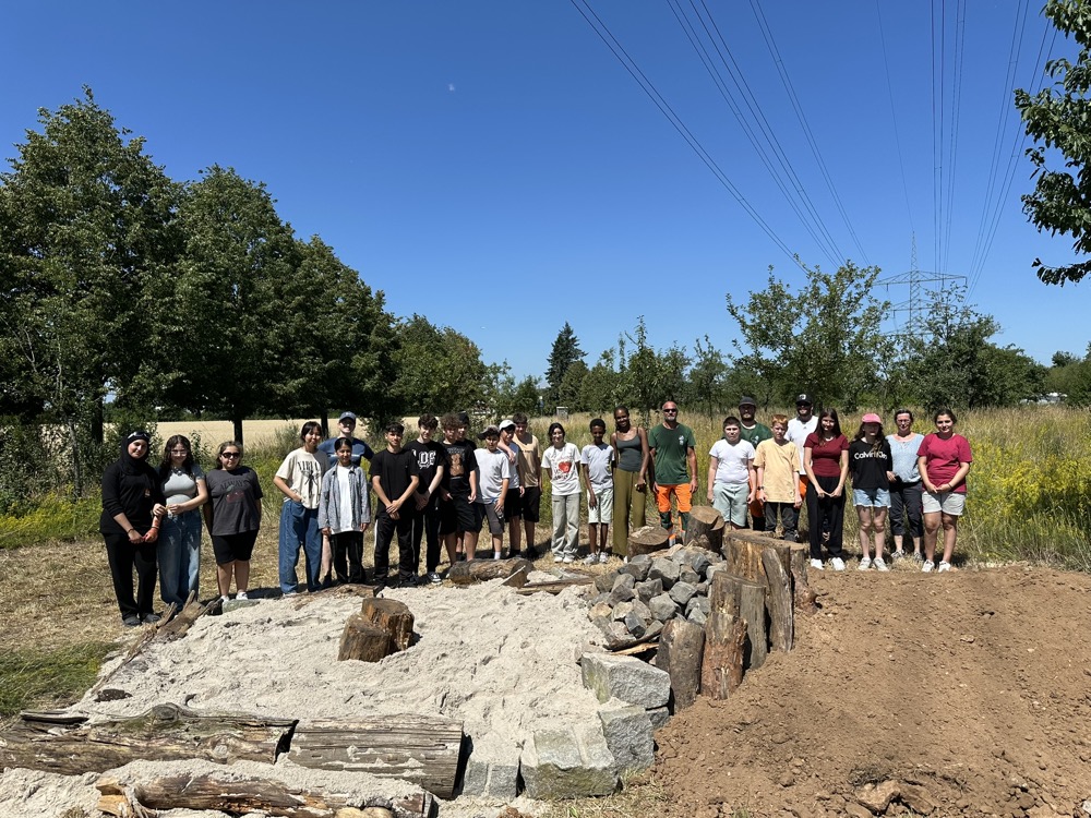 Am Montag, 30. Juni 2025, baute, wir, die Klasse 7.4, gemeinsam mit Frau Jechimer und den Azubis des Bauhofs der Stadt Raunheim ein Eidechsenhabitat. Hierfür füllten wir als erstes Kies in ein großes Loch, das der Bauhof schon für uns in Feldrandlage ausgehoben hatte. Danach folgten deutlich größere Steine und Baustämme. Einige konnte man allein gar nicht tragen, aber mit Teamarbeit landete schließlich alles am dafür vorgesehenen Ort. Frau Jechimer erklärte uns, dass die Zwischenräume zwischen den großen Steinen mögliche die Verstecke für die Eidechsen sind. Neben den Steinhaufen schütteten wir anschließend noch Sand und begrenzten ihn mit weiteren Baumstämmen. Im Sand können die Eidechsen dann ihre Eier ablegen.
