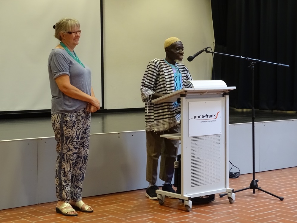 Die Feier wurde musikalisch mit rhythmischen Klängen des „cup song“ von Schüler*innen der Klasse 6.4 eröffnet. Die Schulleiterin Frau Boulannouar hieß die gambianischen Gäste aufs Herzlichste an der Anne-Frank-Schule willkommen. Herr Harnischfeger als zweiter Vorsitzender des Fördervereins Sukuta Wannsee schilderte in seiner Rede die Anfänge der Schule in Sukuta.