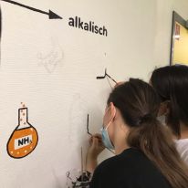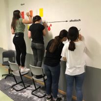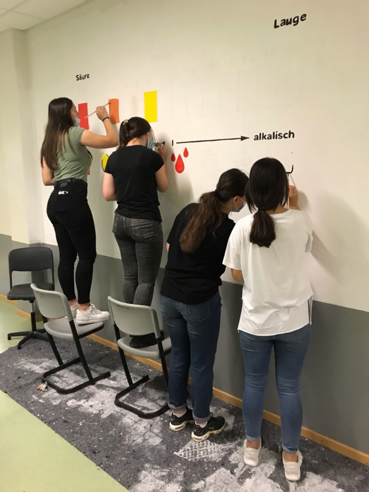 Die Idee kam zwar von unserem Chemielehrer Herr Ghazi, doch wir waren direkt bereit und motiviert sie umzusetzen. Als erstes sammelten wir Ideen am Dienstag, den 15. Juni, und teilten uns in zwei große Gruppen. Wir entschieden uns für das Thema Säuren und Laugen und die PowerPoint-Folien dazu wurden erstellt. Daraus erstellte Herr Ghazi transparente Folien.
