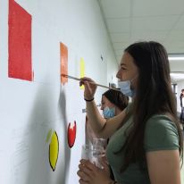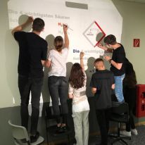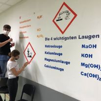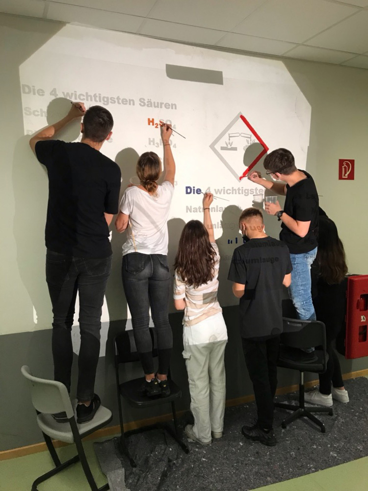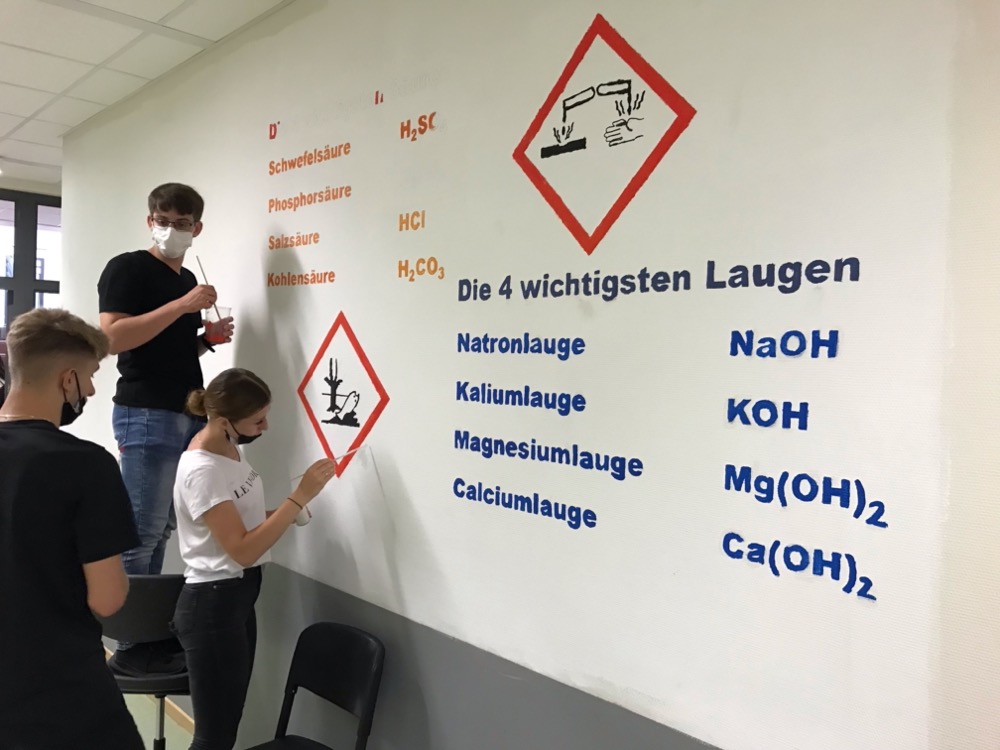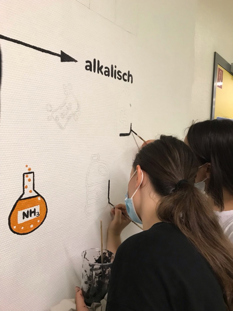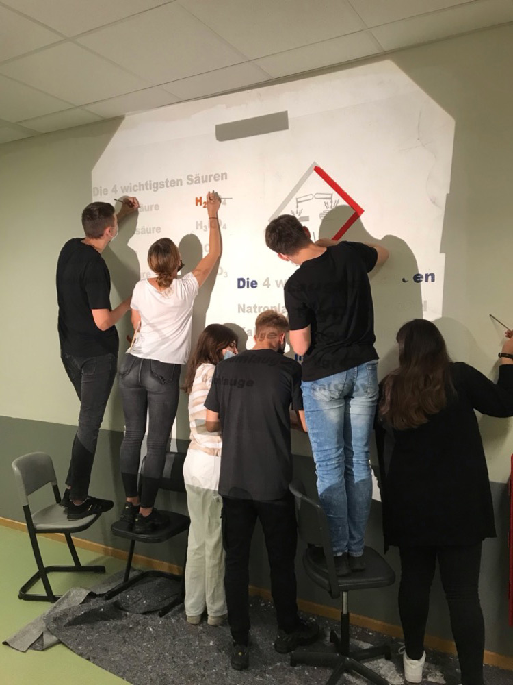 Die Schüler*innen der Klasse 10.2 bemalten die Wand im Chemie-Bereich mit dem Wissen aus dem Unterricht und hinterließen damit ihre Spur, die dort lange bleiben wird.