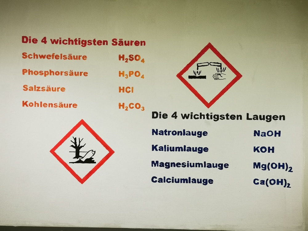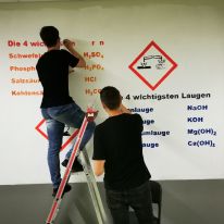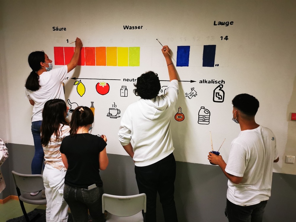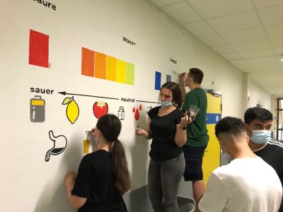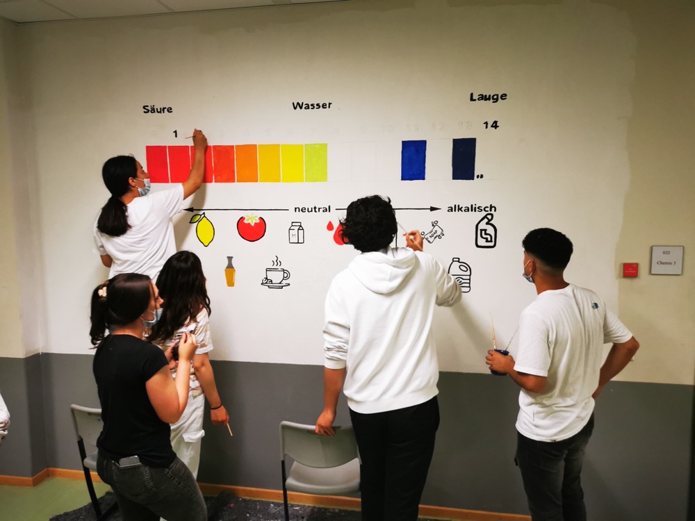 Am 22. Juni begann die Arbeit. Die Wände wurden erstmal wieder weiß gestrichen. Danach nutzten wir den Projektor und die Folien mit unseren Bildern, damit konnte man die PH-Wertskala und wichtigste Säuren und Laugen sehr gut abzeichnen.