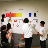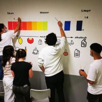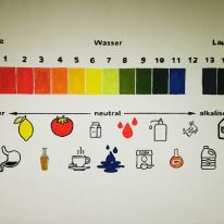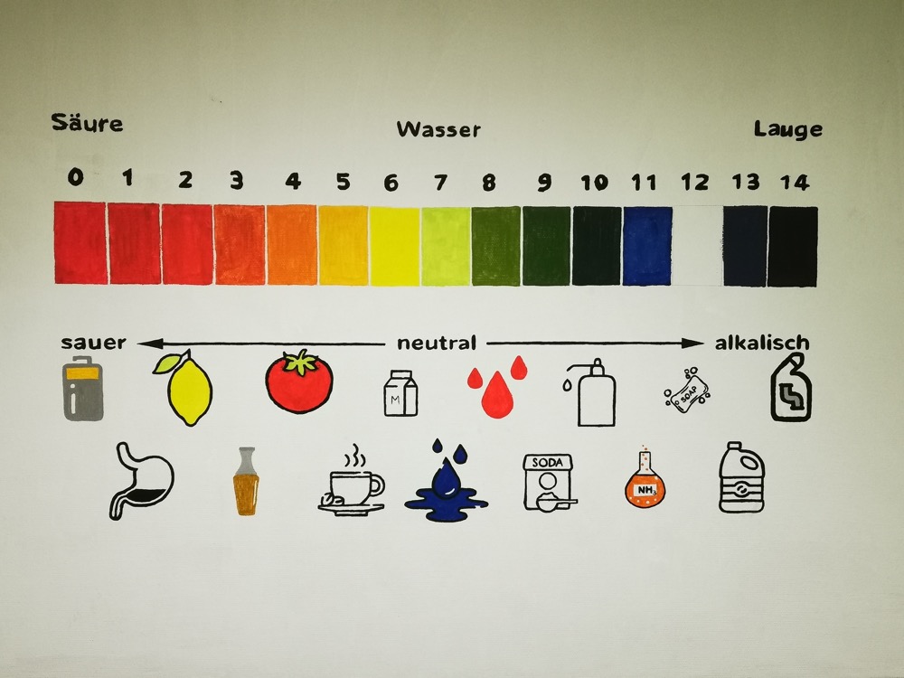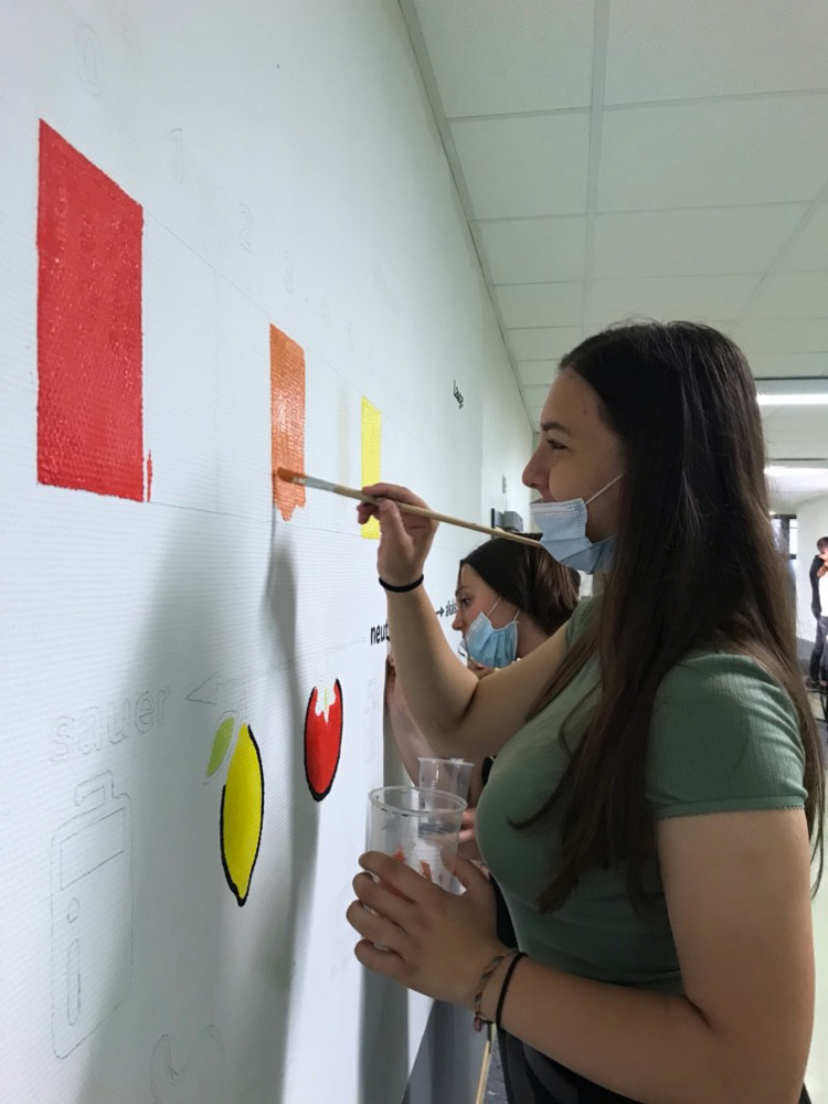 Und zuletzt, am 29. Juni, wurde die Wand wirklich bemalt. Wir bekamen Acryl-Farben zur Verfügung und malten die gezeichnete PH-Wertskala und wichtigste Säuren und Laugen aus. Wir mussten viele Farben mischen, weil die PH-Wertskala 14 verschiedene Farben hat. An dem Tag arbeiteten wir fleißig vier Schulstunden und an dem Tag war es auch fertig.
