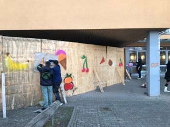 In den vergangenen Wochen widmeten sich mehrere Klassen der AFS im Rahmen des Kunstunterrichts gemeinsam mit ihrem Lehrer Herrn Noack der Verschönerung unserer Mensabaustelle. Dabei kamen, wie unschwer zu erkennen, Graffitis zum Einsatz. Die Motive waren frei wählbar. Viele der Schülerinnen und Schüler entschieden sich passend zur Mensa für Lebensmittel.