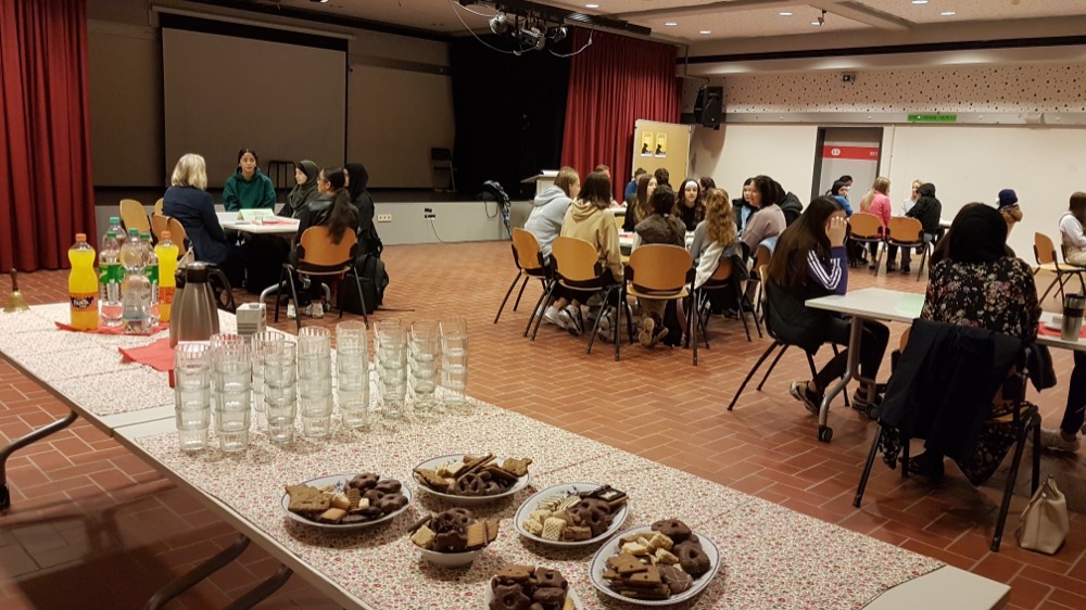 Bei Getränken und Gebäck ließ es sich für die Schülerinnen gut zuhören, Fragen einbringen und Vergleiche zu ihrem Leben anstellen. Fast alle Schülerinnen aus den Jahrgängen 8, 10, der PuSch-Klasse und beiden Sprach-Intensivklassen, insgesamt 90 Schülerinnen, interessierten sich für das Erzählcafé und nahmen an dem zweistündigen Angebot teil. Für manche verging die Zeit zu schnell und gerne hätten sie noch an mehr als 2-3 Erzähltischen gesessen. Aus den Geschichten der Frauen zogen sie vielfältige Informationen und manche wünschten sich eine weitergehende Beratung zu manchen Themen.