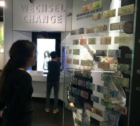 Freitag war der letzte und coolste Tag. Wir fuhren mit dem Zug nach Frankfurt und gingen ins Geldmuseum. Danach führte uns eine Dame durch das Museum. Wir lernten, wie Dinge bezahlt wurden, bevor es Geld gab, sahen Falschgeld und durften sogar einen echten Goldbarren anfassen. Nach der Führung haben wir uns alleine noch eine Stunde umgesehen. Es gab auch ein Kino im Museum mit Drehstühlen, weil die Leinwand an allen Seiten des Raums war. Später fuhren wir mit dem Zug zurück und reflektierten in der Schule die Projekttage.