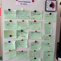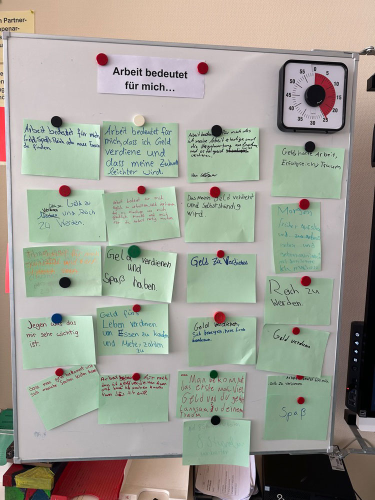 Donnerstag absolvierten wir verschiedene Übungen in Kleingruppen, interviewten unsere Mitschülerinnen und Mitschüler, sprachen über die Berufe unserer Eltern und beschäftigten uns mit Sprichwörtern zum Thema Arbeit. Besonders interessant war dabei, wie unsere Mitschülerinnen und Mitschüler über uns dachten und uns einschätzten u.a. auch im Rahmen eines auszufüllenden Fremdeinschätzungsbogen. Es wurde deutlich, dass wir selbst uns in manchen Punkten ganz anders einschätzen als wir auf andere wirken. Das regte an der einen oder anderen Stelle zum Nachdenken an.