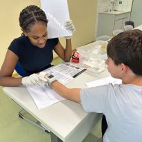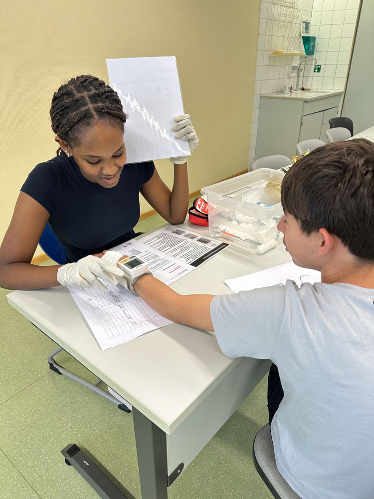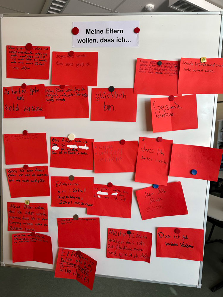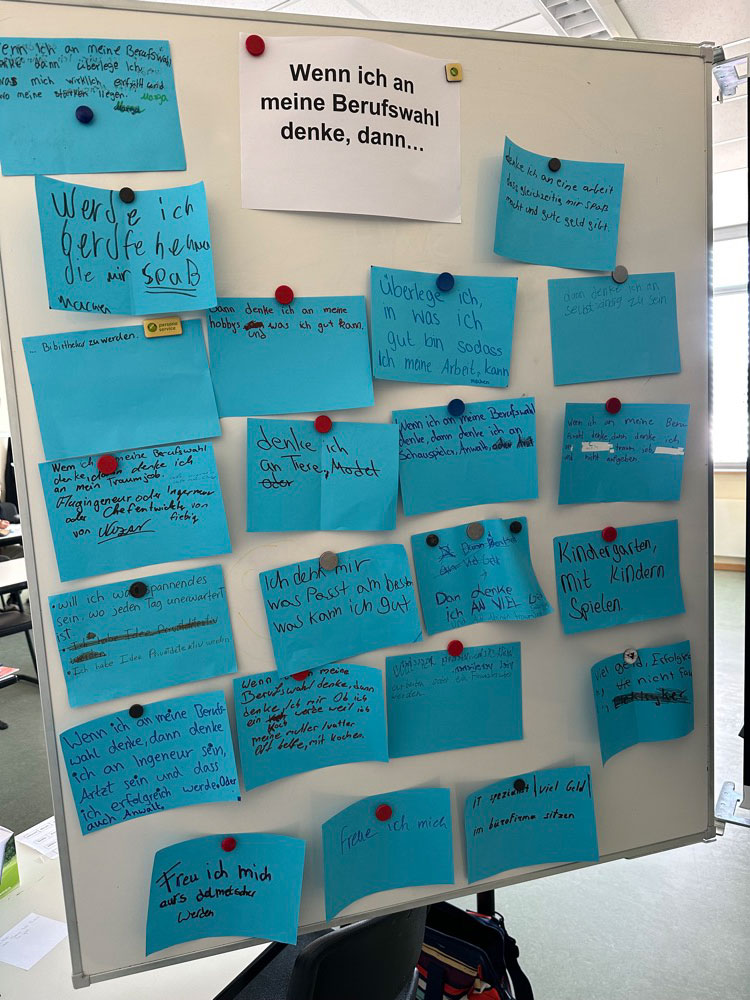 Am ersten Tag bekamen wir unseren „Berufswahlpass“-Ordner und tauschten uns darüber aus, was Arbeit für uns bedeutet, welche Gedanken uns bei der Berufswahl beschäftigen und was unsere Eltern sich für uns vorstellen. Im Gespräch mit Frau Krieg, Frau Kohl und Frau Rinaldi erfuhren wir, wie ihre beruflichen Wege aussahen und dass jede von ihnen verschiedene Stationen durchlief, bis sie schließlich in der Anne-Frank-Schule ankam – beruhigend, dass auch Um- oder Irrwege nicht ungewöhnlich sind. Im PC-Raum nutzten wir online außerdem verschiedene Berufswahltests, um zu schauen, welche Berufe zu unseren Stärken und Interessen passen könnten.