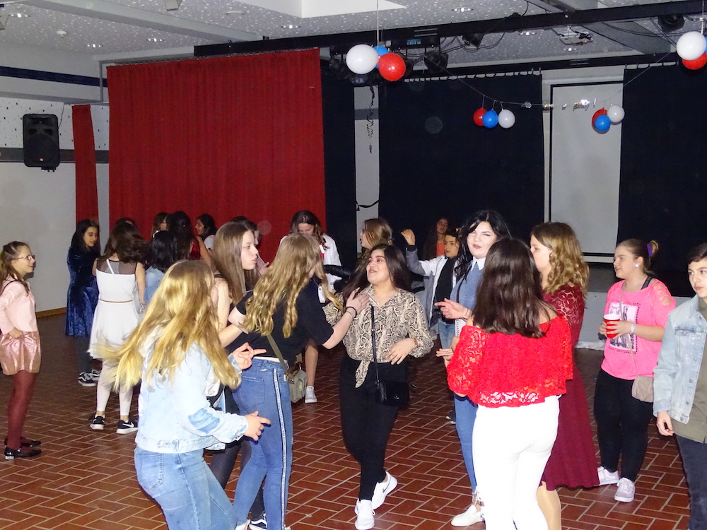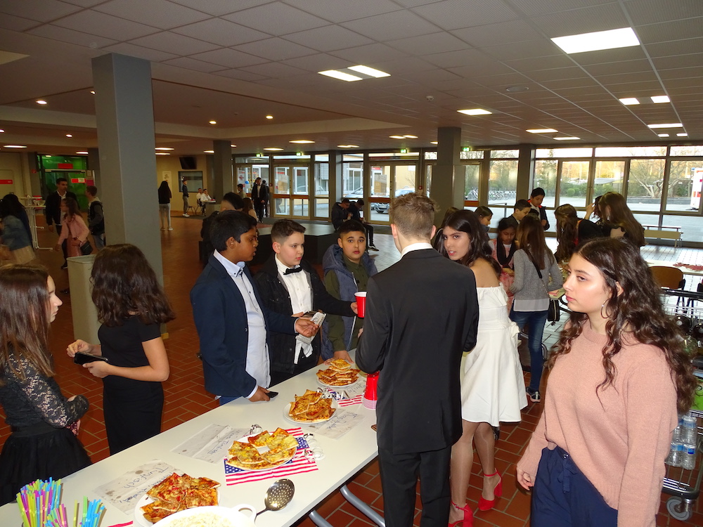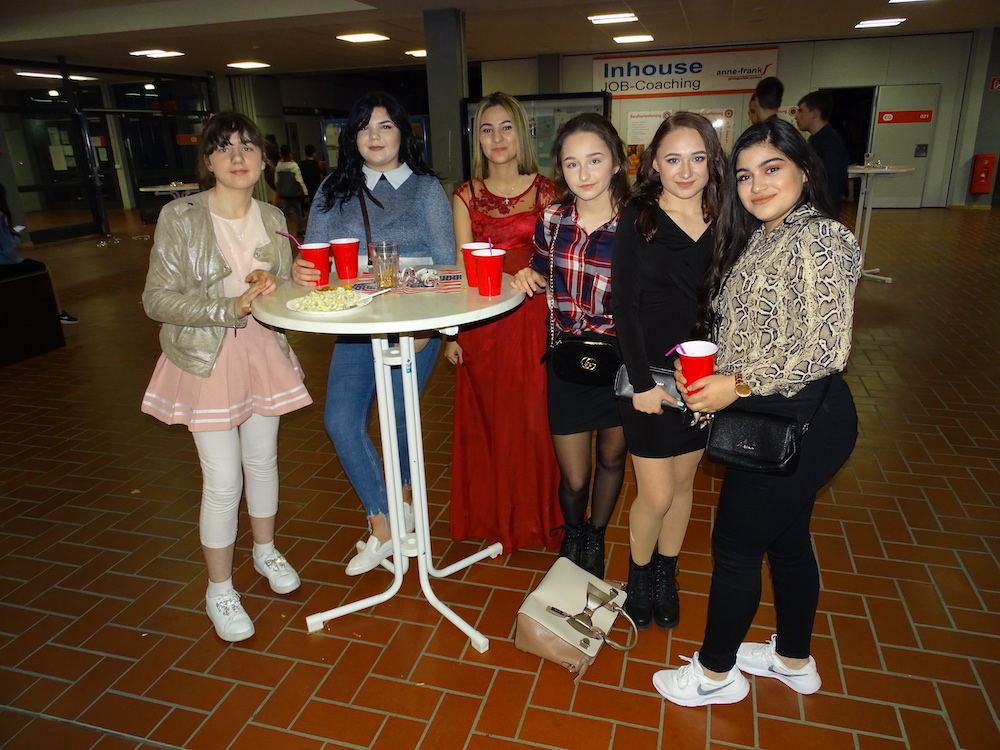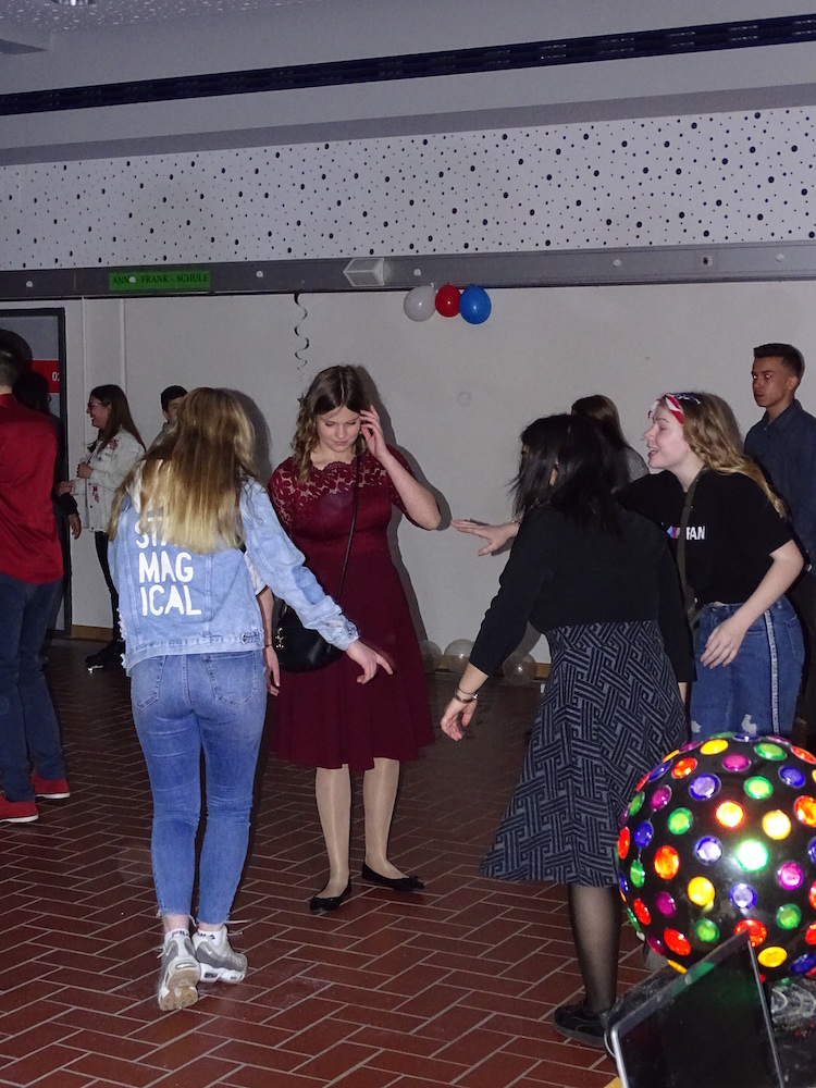 Am 29.03.2019 veranstalteten die Schulsprecher der Anne-Frank-Schule mit Unterstützung des Jahrgangs 10 und der Vertrauenslehrer, Herrn Akkaya und Frau Jahic, einen Schulball in Pausenhalle und Aula. Zahlreiche Schülerinnen und Schüler betraten um 18:00 Uhr in eleganter Garderobe die Schule und die Feierlichkeiten begannen. Das Motto „american style“, das ausgewählt wurde, sowie die Musikauswahl, die von einer Schülerin aus dem zehnten Jahrgang bestimmt wurde, kam bei den Gästen gut an. Nach dem vielen Tanzen braucht man natürlich eine kleine Stärkung: Mit einem Verkauf von Softdrinks, verschiedenen Pizzen, Kuchen, Salat usw. konnten die Schülerinnen und Schüler ihren Hunger stillen. Aber auch für die Liebhaber von Süßem war mit der Candybar etwas dabei. Und wem die Füße vom vielen Tanzen wehtaten, der konnte sich mit kleinen Spielen amüsieren.