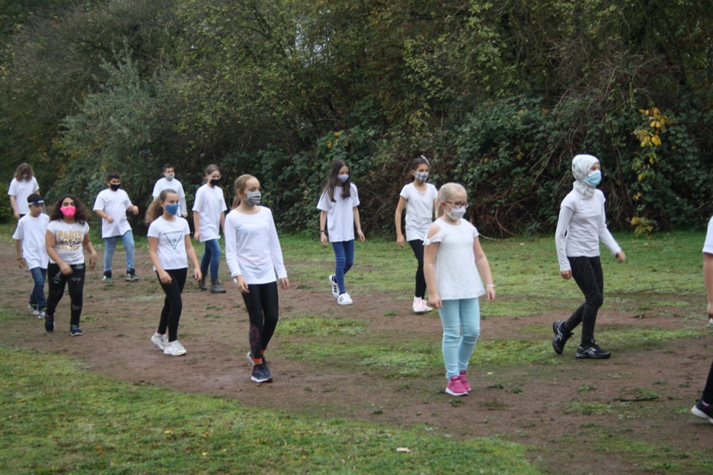 Alldem zum Trotz haben sich die Schülerinnen und Schüler der Klasse 5.3 zu einer Aktion entschieden, die zum Nachmachen einlädt. Mit ihrer Klassenlehrerin Marlies Gehringer hatten sie eine Choreografie zum Lied „Can’t stop the feeling“ einstudiert und zeigten sie vor der Sporthalle.