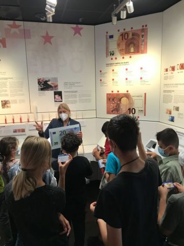 Der dritte und letzte Tag führte die Projektgruppe nämlich ins Geldmuseum nach Frankfurt a.M. Hier hatten die Schüler*innen die Gelegenheit, alles zu erfragen, was am Vortrag nicht (mehr) geklärt werden konnte. Eine Führung zum Thema Falschgeld und eine Rallye durchs Museum rundeten die Projekttage gelungen ab.