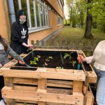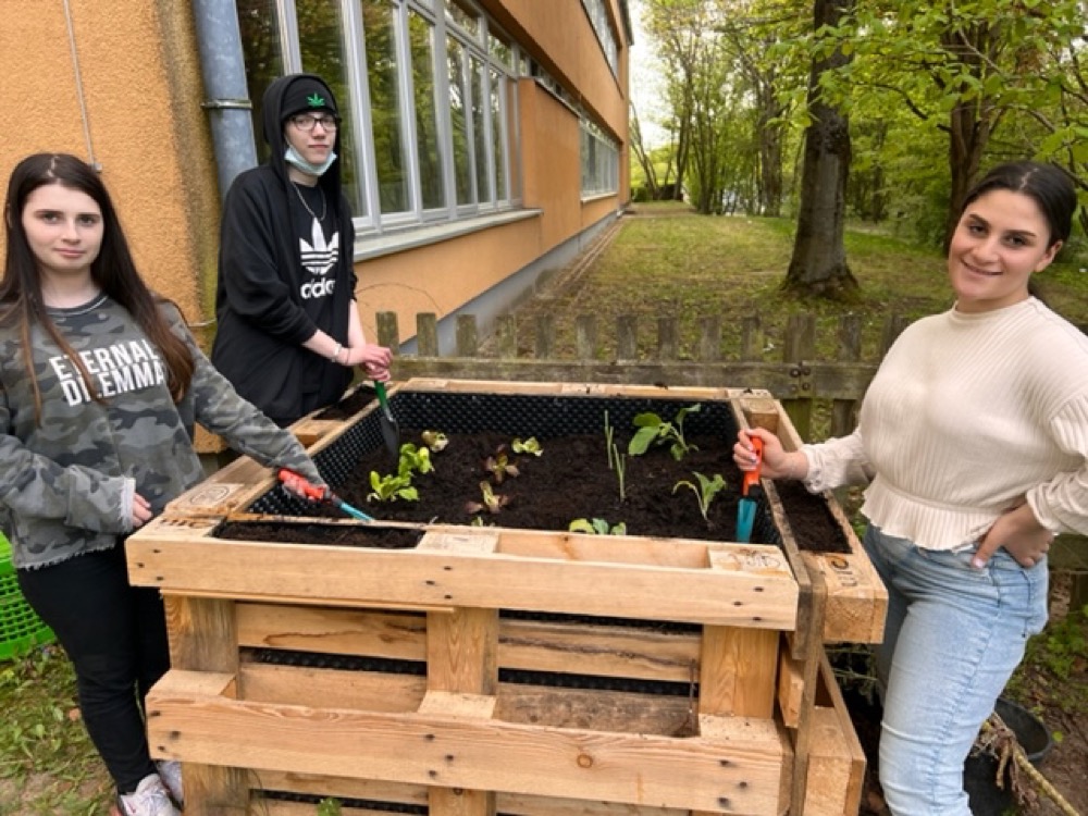 Mit großem Engagement und Freude hämmerten und schraubten Asra Tayboga, Angelina Nau und Michelle Seib ein Hochbeet aus Europaletten zusammen. Dann füllten sie es mit Ästen, Laub und viel Schnittgut von Gartenabfällen. Nachdem über den Winter die Befüllung zusammengefallen ist, kamen Kompost und Erde darauf und mit dem Bepflanzen des Hochbeetes wurde die Aktion abgeschlossen. Jetzt hoffen verschiedene Salate, Lauch, Blumenkohl und eine Aubergine auf Pflege durch die Schulgarten AG. Der wurde das Hochbeet zur weiteren Verwendung übergeben. Und auch die nächste Bepflanzung ist bereits finanziell abgesichert.