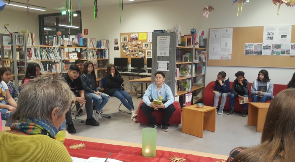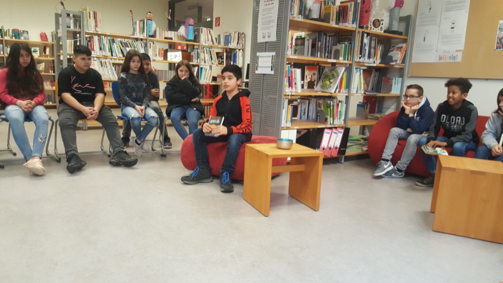 Wir hatten am 27.11.2019 die zweite Runde des Vorlesewettbewerbs. Hierzu sind wir in der 3. und 4. Stunde in die Bücherei gegangen. Wir haben uns erstmal auf die vorbereiteten Stühle hingesetzt. Jedes Kind, das in die zweite Runde gekommen ist, durfte ein Kind zur Unterstützung mitbringen. Die Kinder, die vorgelesen haben, setzten sich auf die Couch.