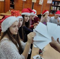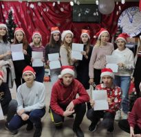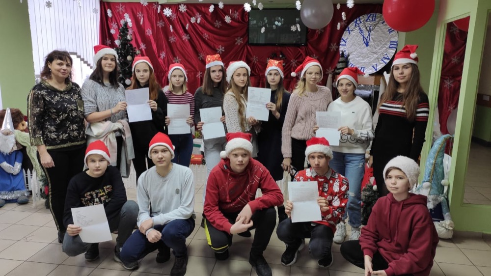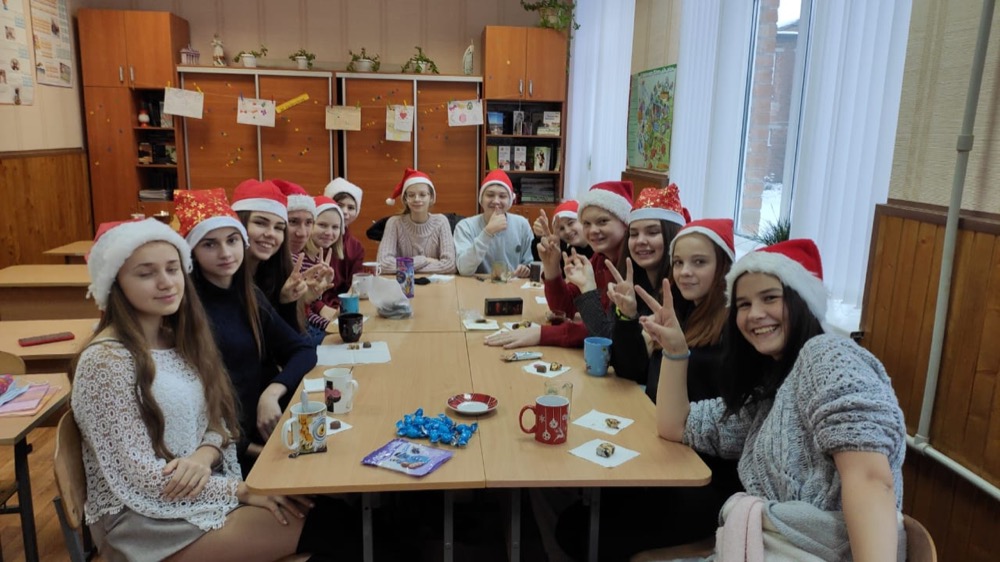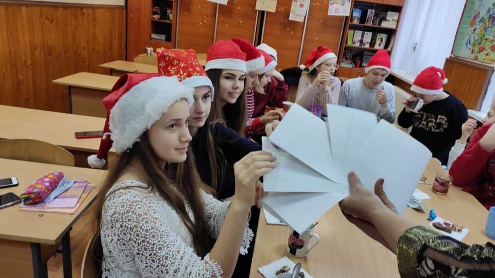 Die ukrainischen Schülerinnen und Schüler aus der Stadt Lubny bekamen von unserem Russischkurs zu Weihnachten ein Paket. Auf den Bildern sieht man den dortigen Deutschkurs mit ihrer Lehrerin Frau Nagorna. Die Schülerinnen und Schüler des Deutschkurses öffneten unser Paket und probierten die Süßigkeiten, die wir ihnen geschickt hatten. Außerdem hatten unsere Schülerinnen und Schüler ihnen Briefe geschrieben und im Paket mitgeschickt. Einige Briefe wurden bereits von den ukrainischen Schülerinnen und Schülern beantwortet. Freundschaften entsteht auch in der Corona-Zeit und werden sie auch überstehen.