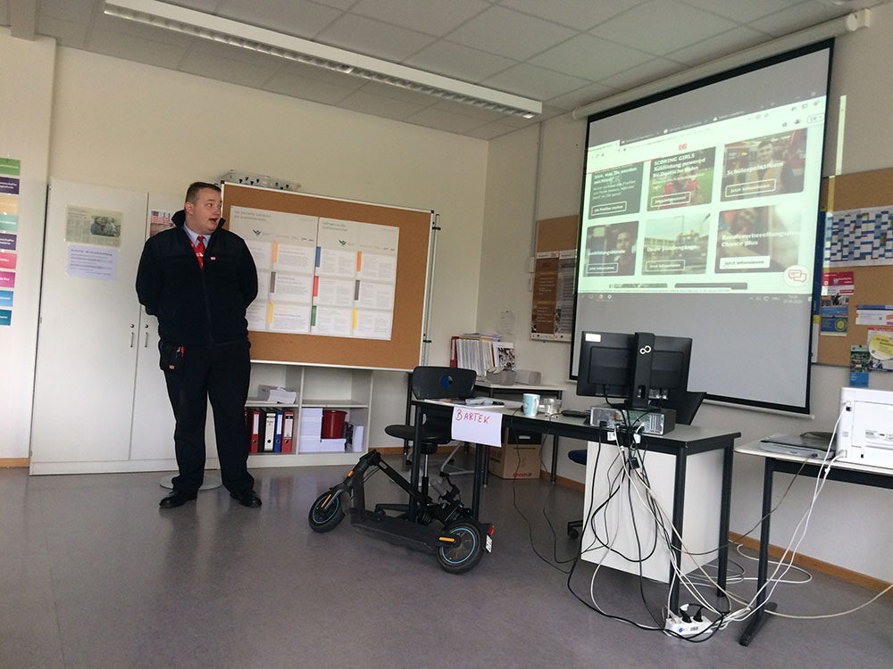 Den Schüler/innen empfiehlt er, sich auf der Karriereseite der Deutschen Bahn über die vielfältigen beruflichen Möglichkeiten – Schülerpraktika, mehr als 30 Ausbildungsberufe, duale Studiengänge, ... - zu informieren. Dieses Jahr wurden 4700 Azubis eingestellt. Die beruflichen Chancen bei der Deutschen Bahn sehen rosig aus, da in den kommenden Jahren 100.000 Mitarbeiter/innen in Rente gehen.