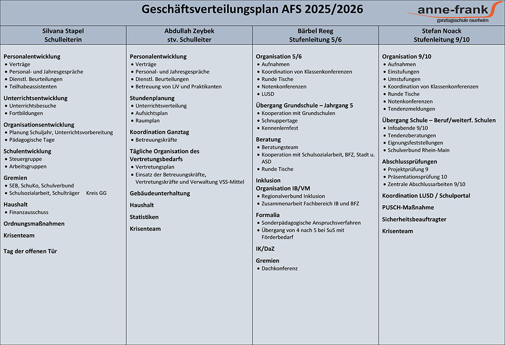 Verschaffen Sie sich nachfolgend einen Überblick, wer was an der Anne-Frank-Schule macht.